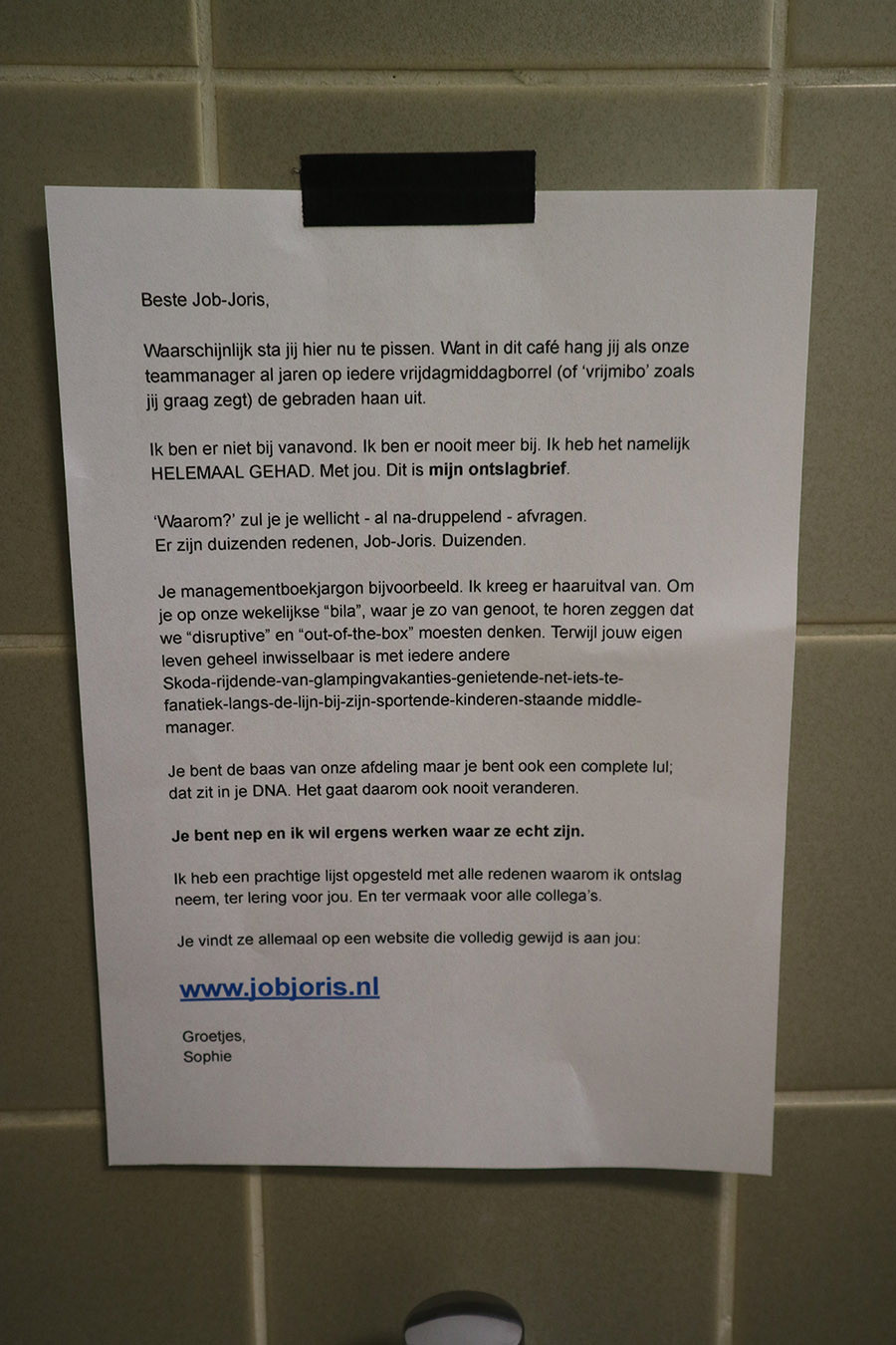 In meerdere kroegen in Rotterdam, waaronder Melief Bender, hing vrijdag een opmerkelijk briefje boven het mannen urinoir. Het was een ontslagbrief van een Sophie aan haar manager Job-Joris die in die brief met de grond gelijk wordt gemaakt.
