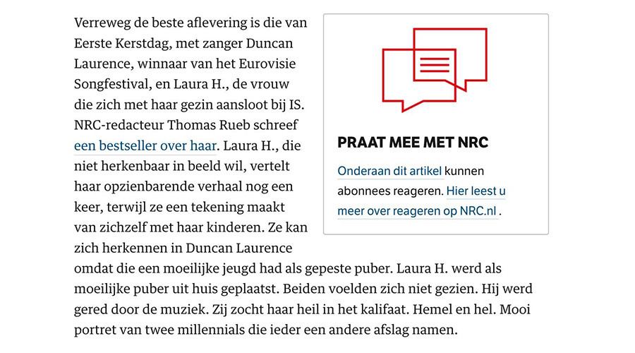 Maar meer nog ergerde Versnel zich aan de inleidende recensie in de lezersrubriek in het dagblad NRC. Daarin las men ''dat Laura H. zich kon herkennen in de zanger Duncan Laurence – ook gast in het programma – omdat die een moeilijke jeugd had gehad als gepeste puber. Laura H. werd als moeilijke puber uit huis geplaatst. Mooi portret van twee millennials die ieder een andere afslag namen.''